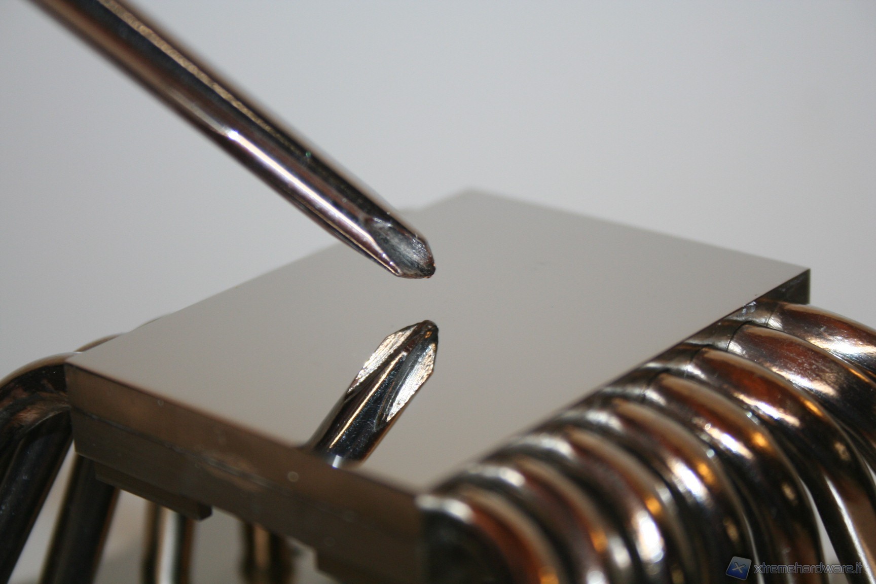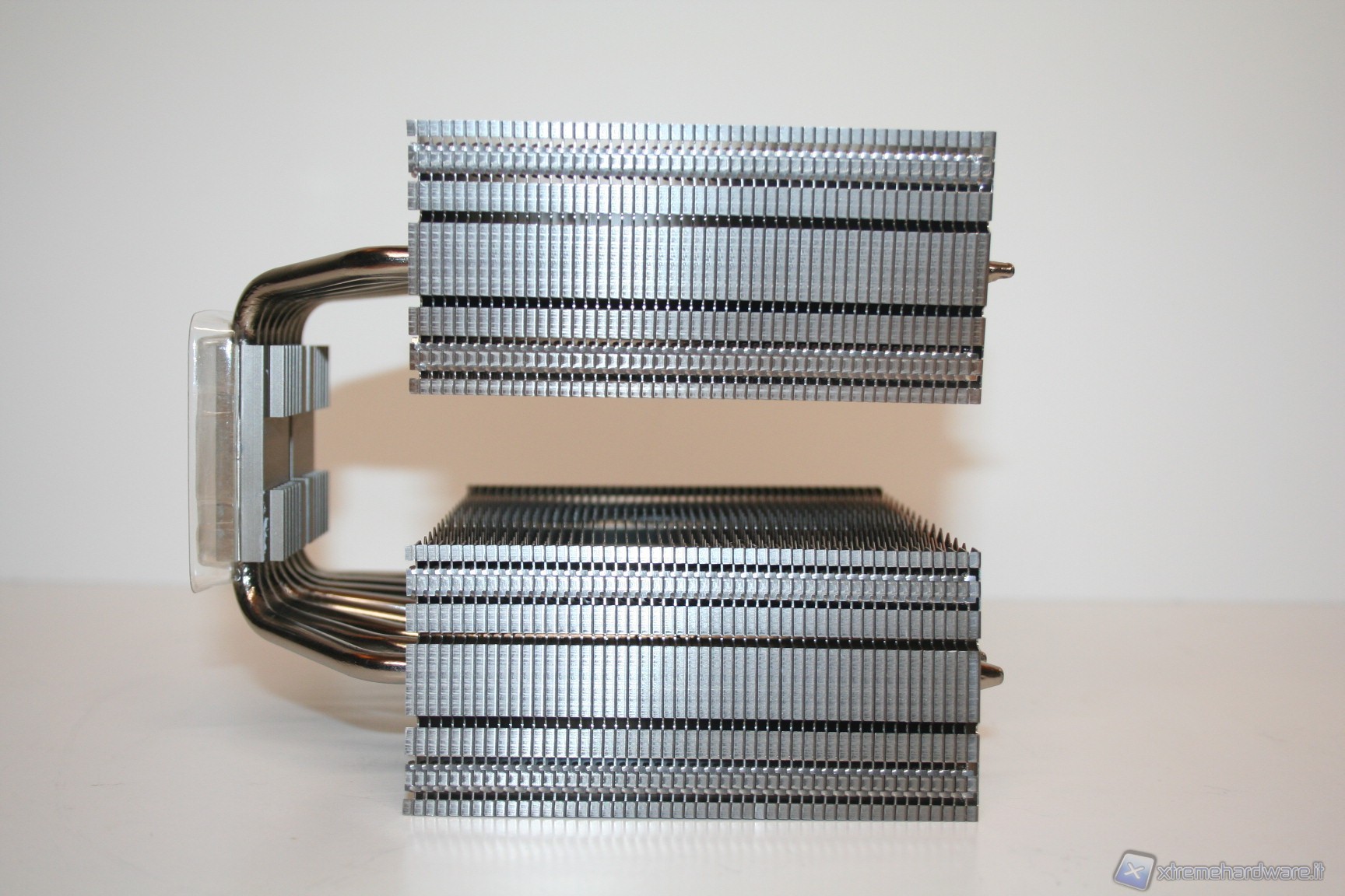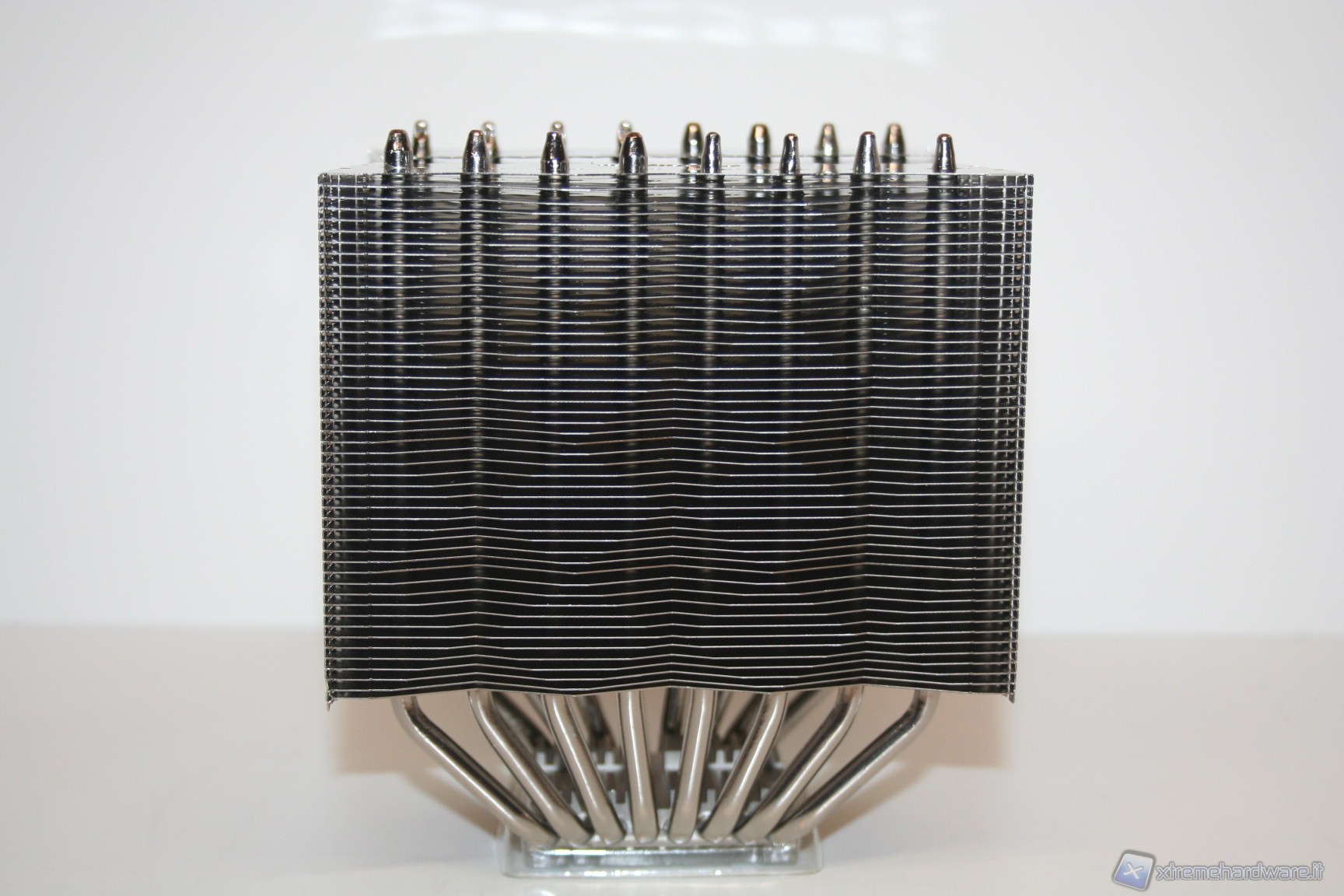 Le alette purtroppo non sono saldate alle heatpipes, sebbene ci sia un’elevata solidità strutturale, derivante anche dalla chiusura laterale dell’unità; ottima anche la qualità delle heatpipe stesse, ed anche qui è stato aggiunto del nickel, per evitare fenomeni di ossidazione nel tempo. La finitura è semplicemente ottima, come le impressioni generali. Vogliamo farvi notare anche la finitura terminale delle heatpipes, che sebbene non presenti un cappuccio terminale come altre marche, è nickelato e di eccellente fattura. Nella parte bassa inoltre potrete notare la presenza di un rudimentale dissipatore passivo, e una depressione centrale che servirà all’atto del montaggio.