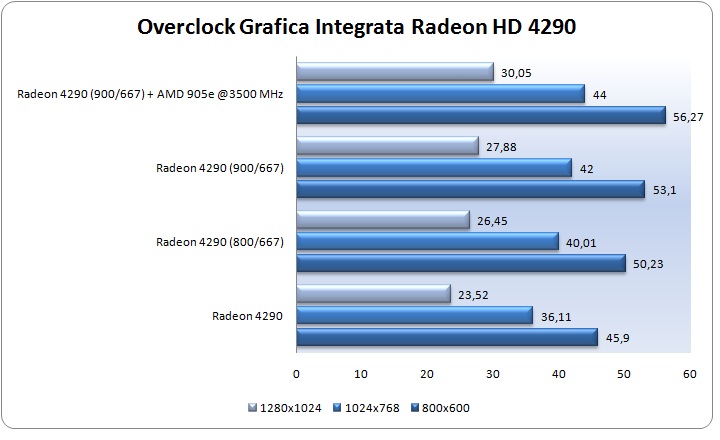 Dopo aver messo sotto stress le due cpu per trovare la massima frequenza stabile, abbiamo deciso di fare la stessa cosa anche con la IGP AMD 890GX, e siamo rimasti stupiti dai risultati raggiunti, in quanto siamo stati capaci di raggiungere la frequenza sul core di ben 900 MHz, mentre per la memoria abbiamo potuto selezionare come massimo 667 MHz da bios. Ecco i risultati che abbiamo raggiunto utilizzando come riferimento il gioco Crysis: l'incremento del frame rate rispetto alle impostazioni default è stato apprezzabile.